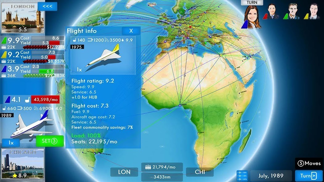 Transport passengers from city to city and compete against other tycoons for airline business domination!The game tries to simulate airline business with realistic economy, competition and strategy.
