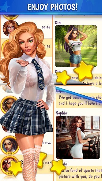 The radar application pointed to the Campus, which is located very close. There you meet three charming students who are clearly interested in you and are eager to communicate with you.Each has unique qualities and each needs to find its own approach. The approach to the hearts of girls lies through gifts and flirting, you can show all your amorous skills using a slot machine and your wit.
