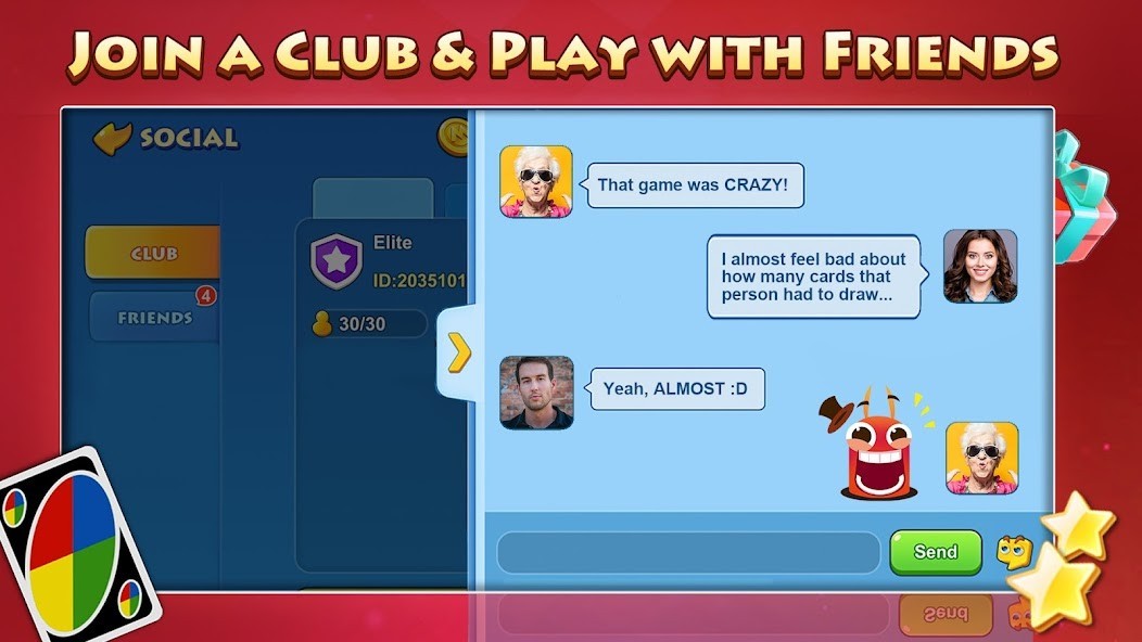 Connect with your buddies in UNO!™ with clubs and send each other gifts. Make a strategy and remember to shout UNO before anyone else.