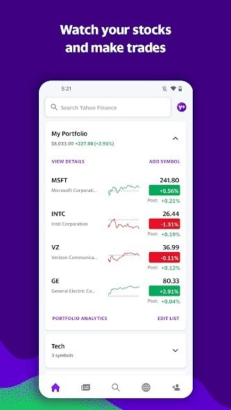 • Link your portfolio to Yahoo Finance and keep tabs of your holdings on the go. See your holding’s daily performance at a glance in the “Home” tab